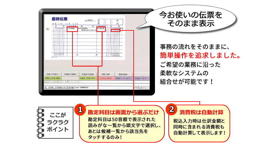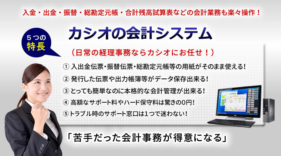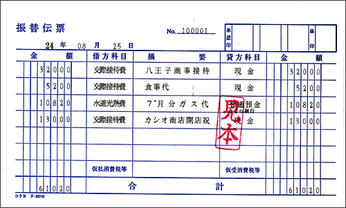 また、振替伝票(仕訳伝票)は小切手を使用した際や、銀行口座を使用した取引の際にもよく使われる伝票です。振替伝票(仕訳伝票)には日付、金額、借方科目、貸方科目、摘要等を記入します。これらの会計伝票は日常的に伝票印刷するものなので、集計した時に、ミスが無い様、記入の際は慎重かつ正確に行わなければなりません。カシオの会計システムは入力した金額を自動計算し、集計まで行う事が可能なので計算ミスも防げます。また印字もキレイに素早く発行出来ます。