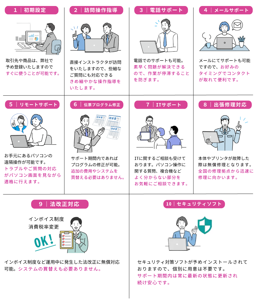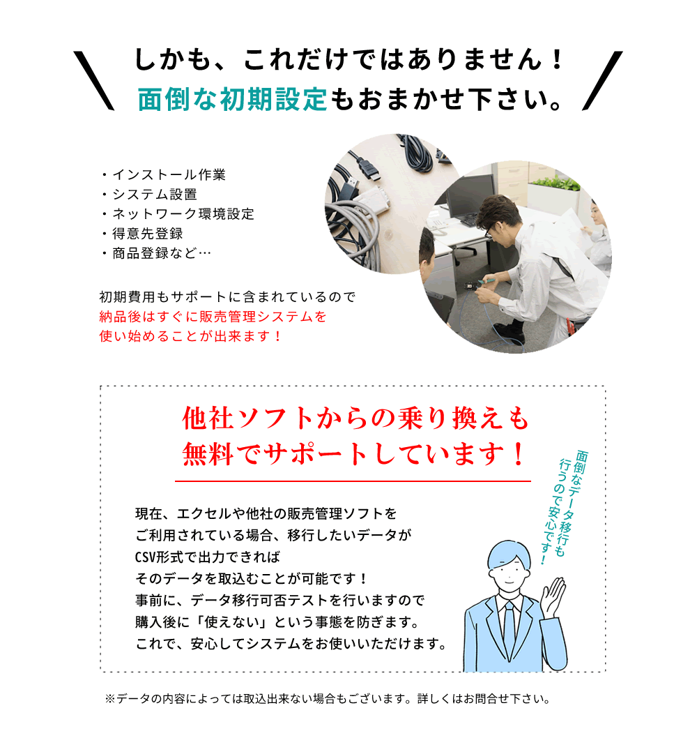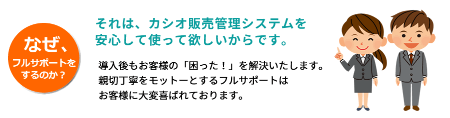 カシオ販売管理システムは、オールインワンの販売管理パッケージです。導入した会社の事務の流れに合わせてシステムを構築します。この点が「使いやすい販売管理システム」とご評価をいただいている最大の理由です。お客様の変化に対応し「いつまでも使いやすい販売管理システム」として喜んでお使いいただけるように私ども東洋通信はサポートをしてまいります。そのため営業エリアは、私どものサポート・サービスを提供できるエリアに限定させていただいております。