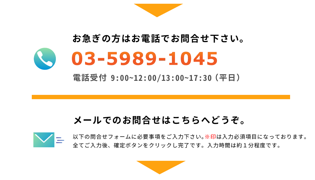 弊社へのお問い合わせは、入力フォームの所定項目をご入力いただき、個人情報の取り扱い関する下記の事項についてご同意の上、お問い合わせください。暗号化した入力フォームをページに埋め込めており、通信内容は暗号化して送信されます。こちらからしつこい営業等は一切行いませんので、お気軽にお問い合わせ下さい。お急ぎの際はお電話でも承っております。