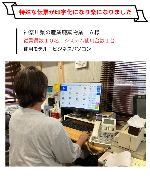 私たちは産業廃棄物を取り扱う仕事ですので、3種類のマニフェスト伝票を作成していました。日々、手書きで作成していたので分厚い複写伝票を何冊も作成するのは大変で肩凝りもひどかったです。