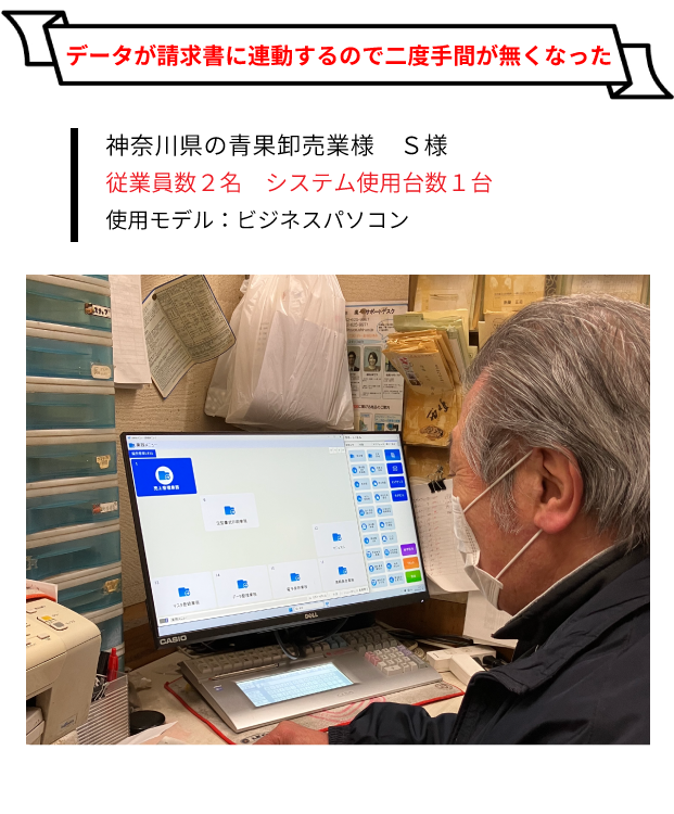 また、当社の商品は季節ごとに入れ替わることが多いので、お客様から「前回、注文した商品をもう一度頼みたい」と言われた時に、以前は前回の商品を探すのが大変でしたが、今では、会社名や商品名、日付、電話番号など好きな方法で顧客データをすぐに呼び出せるので前回売った商品もすぐに呼び出せるようになりました。