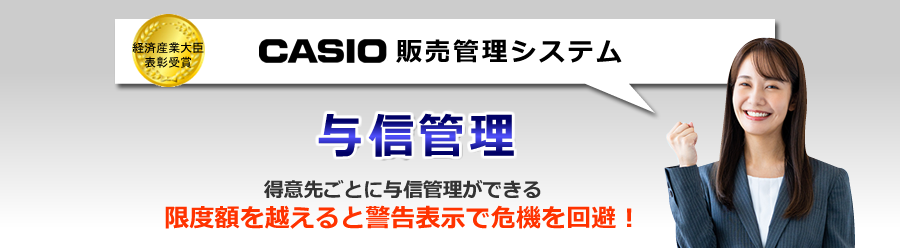 カシオEX販売システムでは、得意先ごとの与信限度額を登録することで、伝票入力時に売掛残高などが、上回った時点で注意または警告表示することができます。