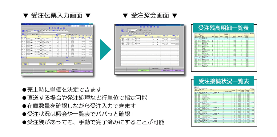 まず商品を受注したら、受注内容をシステムに入力し、受注伝票を印刷できます。伝票は市販の伝票でも、得意先の指定する伝票でも印刷可能です。