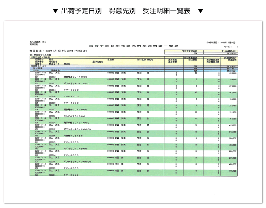 受注残数量は、受注を請けたが未だ売上として処理されていない(出荷していない)状態の数量を表します。その受注残情報を得意先別や出荷予定日別に画面に表示することが出来ます(受注照会画面)。また、出荷予定日別の一覧表を印刷することも可能です。これで、漏れのない受注管理が可能となります。
