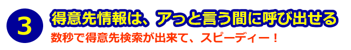 得意先の選択には、略号、コード一覧、会社名、フリガナ、電話番号、コード入力から、探しやすい方法を選び、すぐに呼び出したい得意先データが表示されるので、検索に時間を掛けることなく、スピーディーに伝票発行が開始出来ます。(下図を参照下さい)