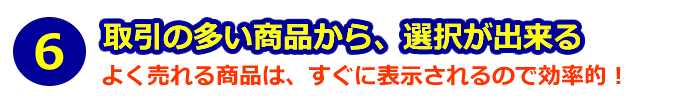 商品の選択方法には、略号、コード、名称、フリガナ、分類、バーコード入力、取引回数順があり、探しやすい方法を選べて、すぐに呼び出したい商品データが表示されます。検索に時間を掛けることなく、スピーディーに伝票作成が出来ます。(下図を参照下さい)