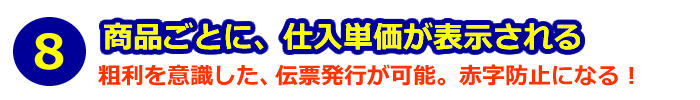 納品書発行画面に、各商品の仕入単価を表示させることが出来ます。仕入単価を確認出来ることにより、粗利を意識した伝票発行ができます。また、金額ミスなども発見しやすく、損失防止に役立ちます。