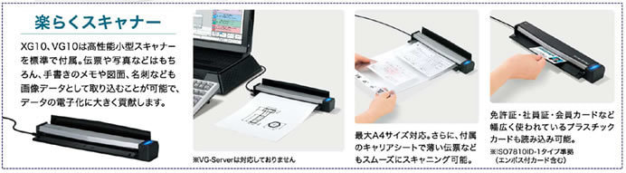 高性能小型スキャナーを標準で付属。伝票や写真などはもちろん、手書きのメモや図面、名刺なども画像データとして取り込むことが可能で、データの電子化に大きく貢献します。