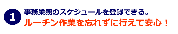 事務員さんが忘れないための事務業務スケジュールを登録することが出来ます。これを登録することにより、毎月やるべき事務の仕事を漏れなく行えます。