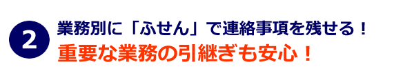同じ業務を複数の事務員さんが使う会社には最適な機能です。例えば、売上業務の画面に「商品に関する特記事項」を残せば、事務員さん間で共有できるので、「聞いていない」という事態を招かず、事務員間のトラブルも回避できます。