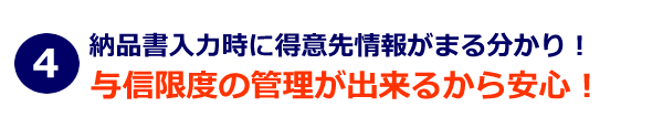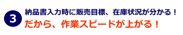 納品書(見積書)入力時に、得意先コードにカーソルが当たれば、与信枠や販売目標が自動表示され、商品コードにカーソルが当たれば、その商品の在庫状況や利益率が表示されます。これで、時間をかけて調べていたデータが瞬時に分かり、事務員さんのストレスが軽減されます!