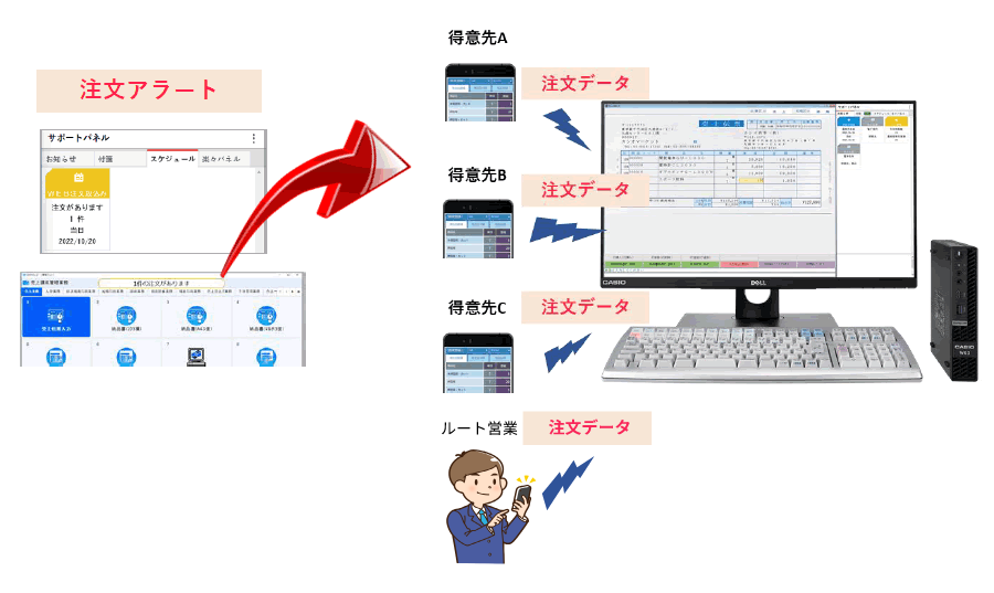 得意先のスマートフォンから商品の注文が入ると、カシオ販売管理システムの画面に注文アラート(お知らせ)が表示されます。そのまま「受注取込み」を行うことで注文データが自動でシステムに連動します。納品書作成時には、その注文データを呼び出せるので、一から入力することなく簡単に伝票作成が出来るので、事務効率がアップします!